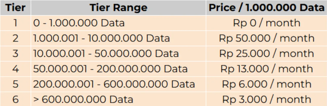- Tier 2: 1.000.001 hingga 10.000.000 Data / Bulan